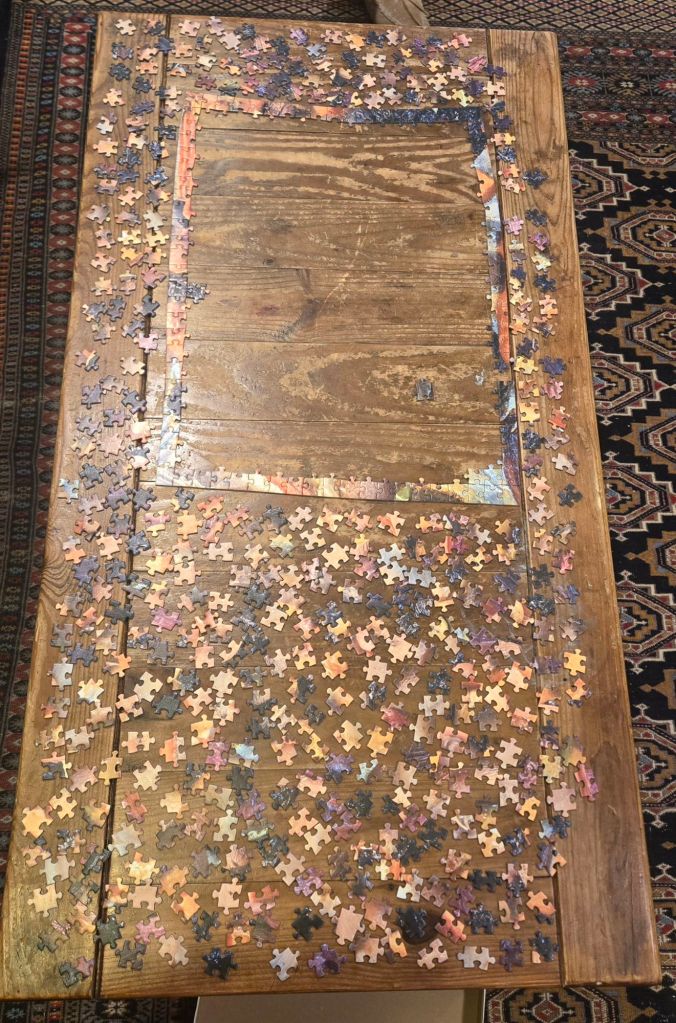 Friday, with help of Hannah and with one spot missing we put together the perimeter of the puzzle.