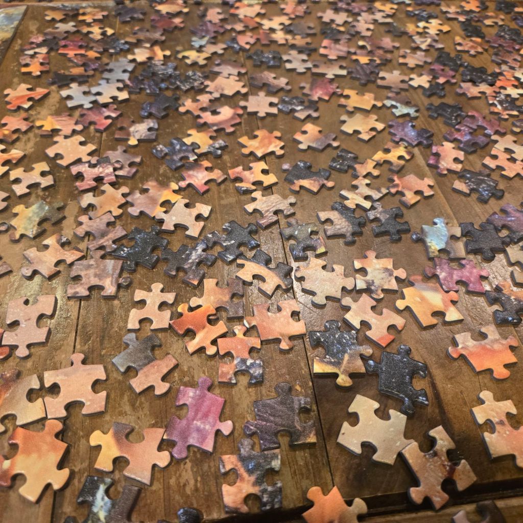 Yesterday, I set the pieces on the table next to the puzzle, not yet assorting them in any way.