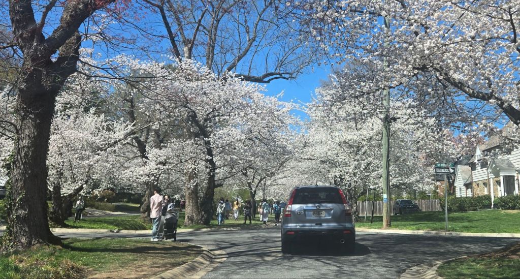 We didn’t go to the Tidal Basin, but we took 5 year old Izzy to see the magnificent display of cherry blossoms in close-by Kenwood MD, a fairly extensive area that sees gawkers in cars and on foot every spring. At first, he enjoyed them, but in the middle of the third block, he said very politely, “Let’s leave this neighborhood. I’ve seen enough”.