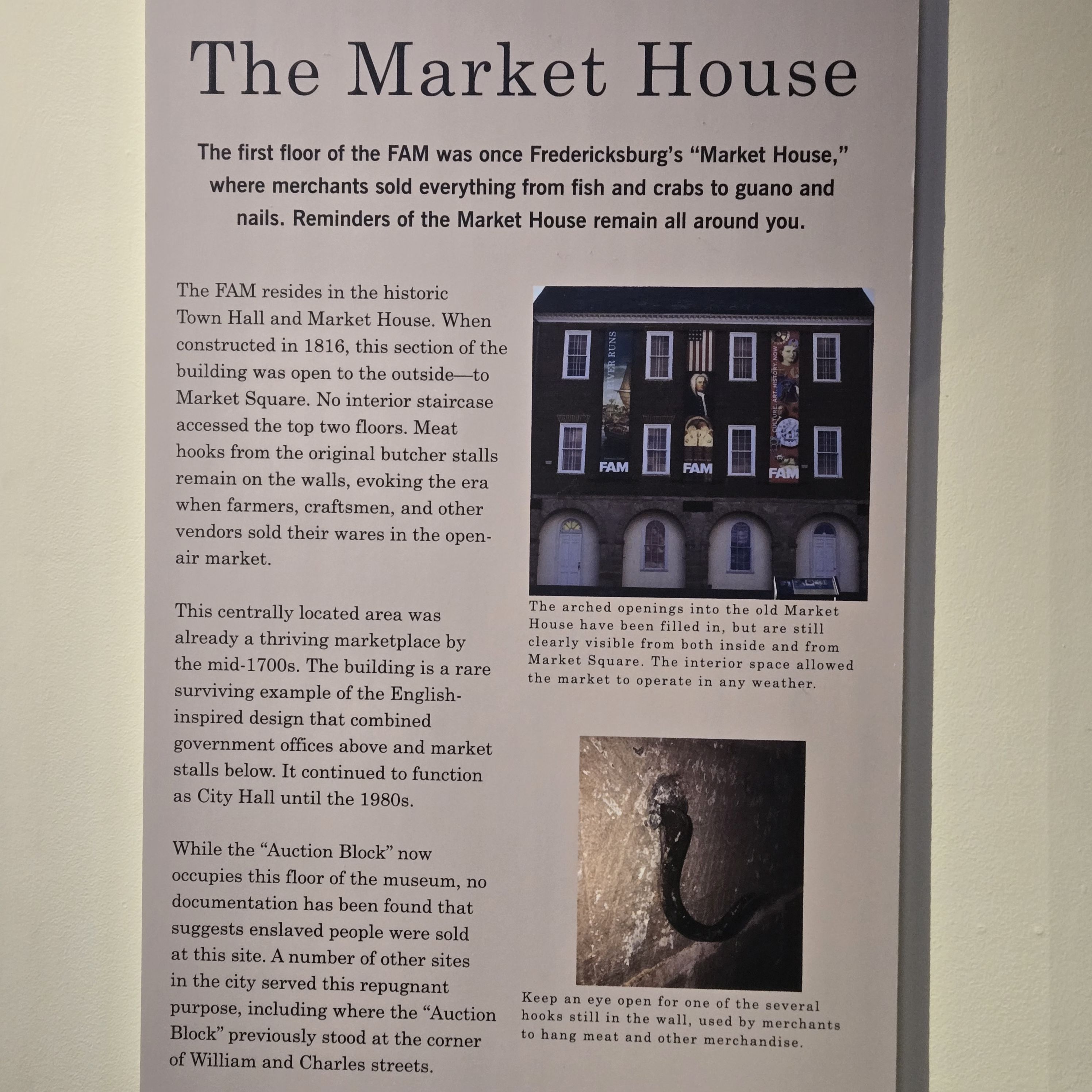 The building is the former city hall, a three story building from the 1840s. The first floor was a food market, with no access to the other two floors. Apparently, this was an Eglish style, rarely used in the US.