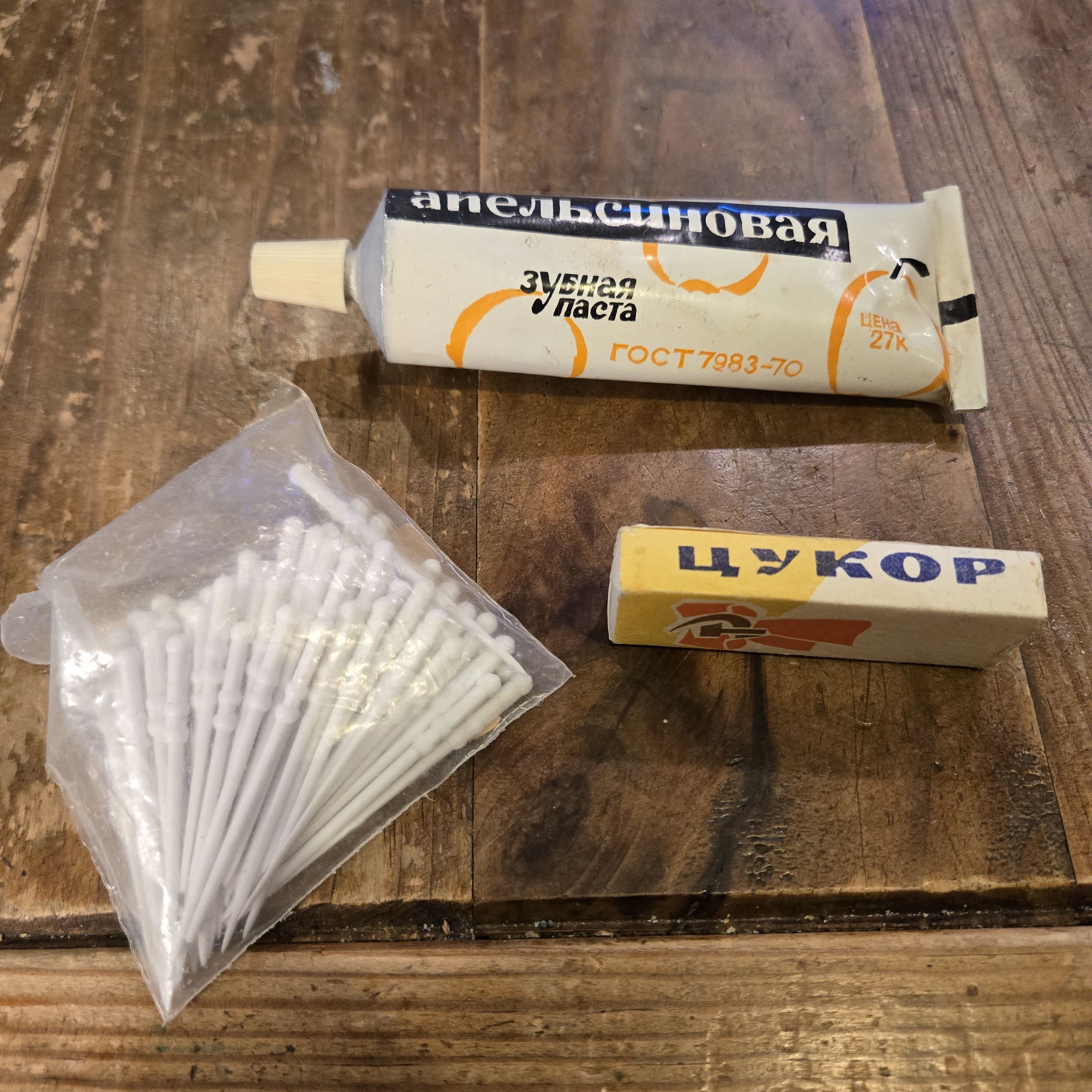 I brought back a lot of souvenirs when I visited the Soviet Union in 1974, including toothpaste, a sugar cube, and platic toothpicks. Yes, also some things that were worth more rubles. But they weren’t in the box.