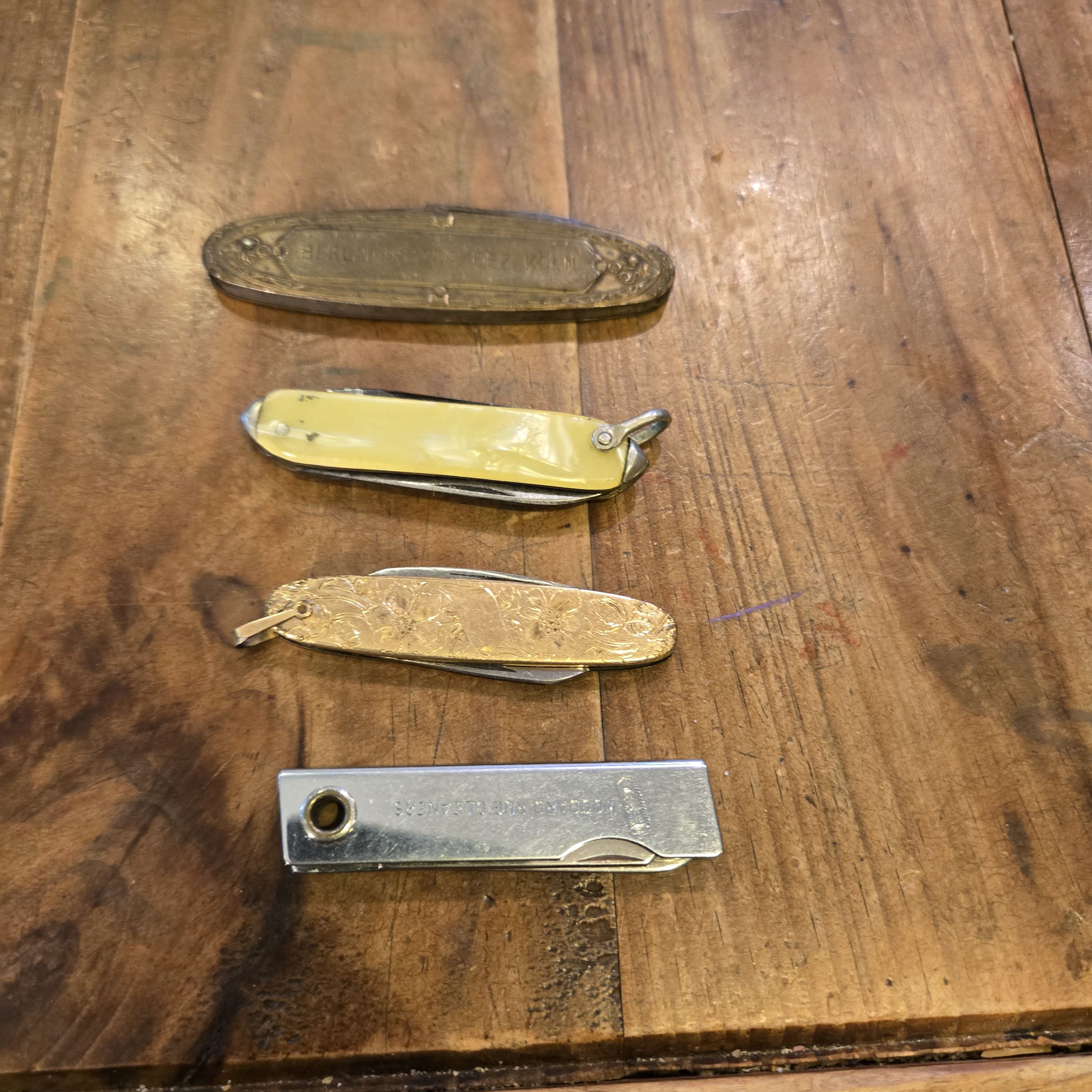 Yesterday, it was letter openers. Today, pocket knives. One is German. The others, probably not.