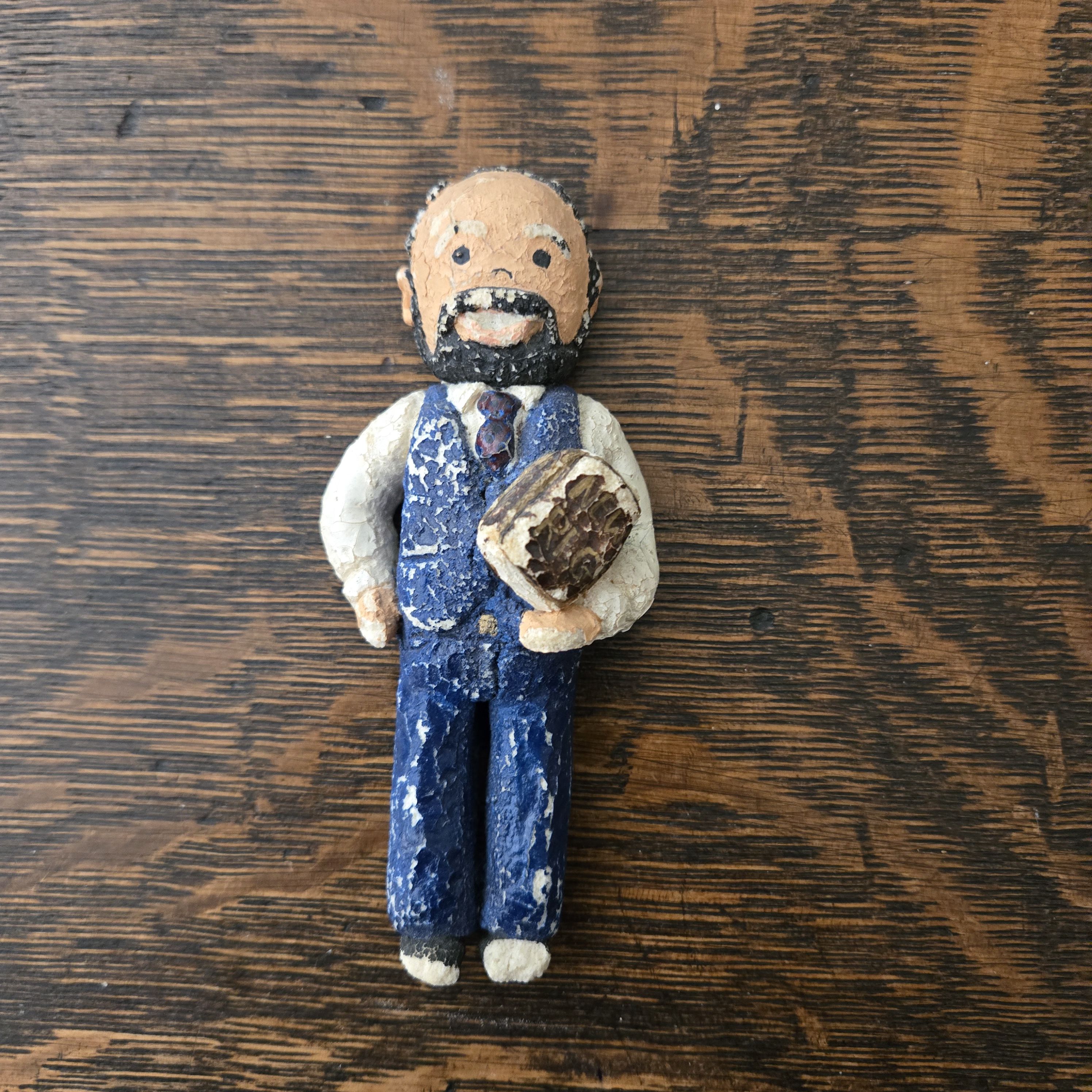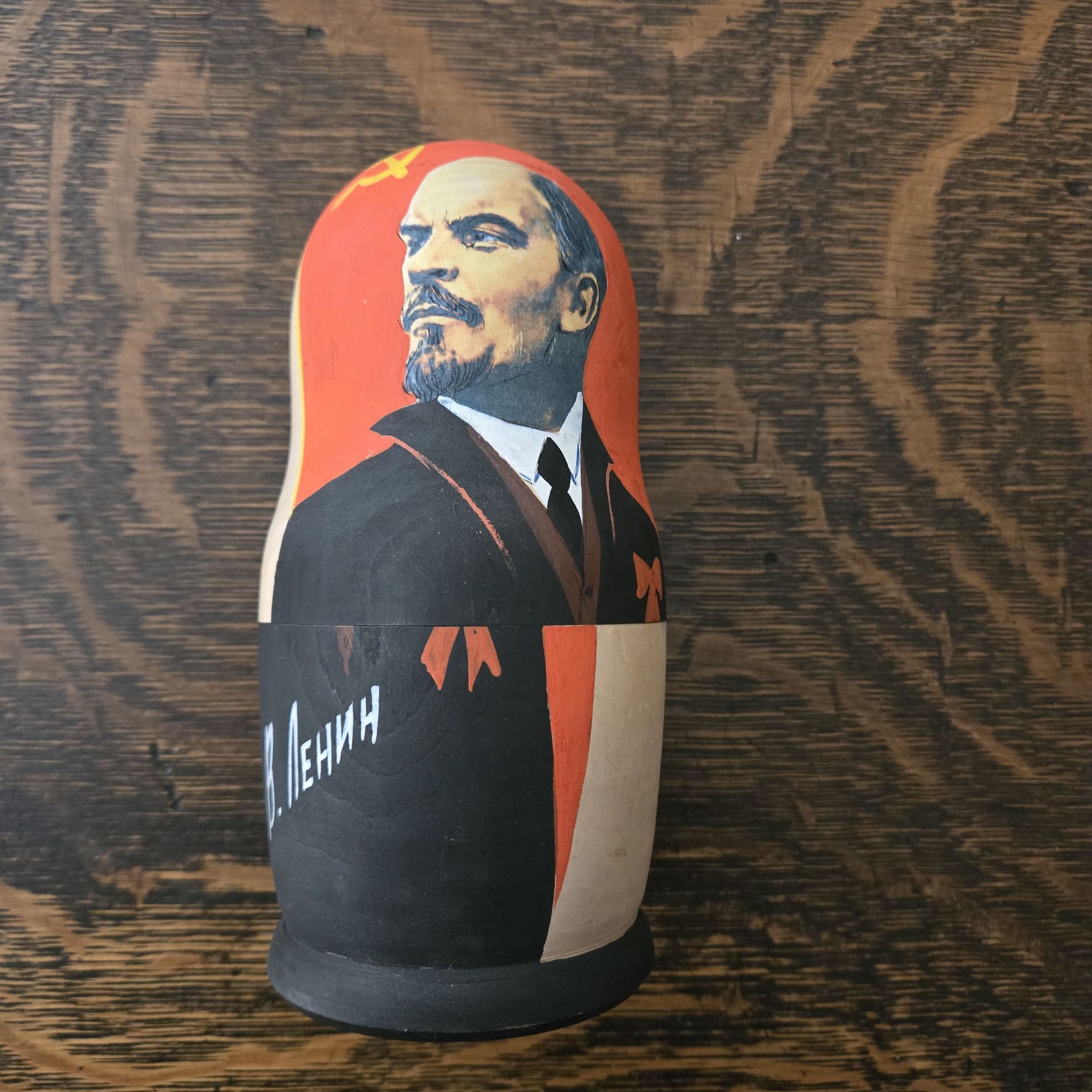 This is the largest of a series of nesting dolls that goes from Lenin to Stalin to Khrushchev and on. Sadly, I think they have tightened or dried out because I can not open them up. Did I get this on a trip to Russia? Nope. At a street fair in New York.