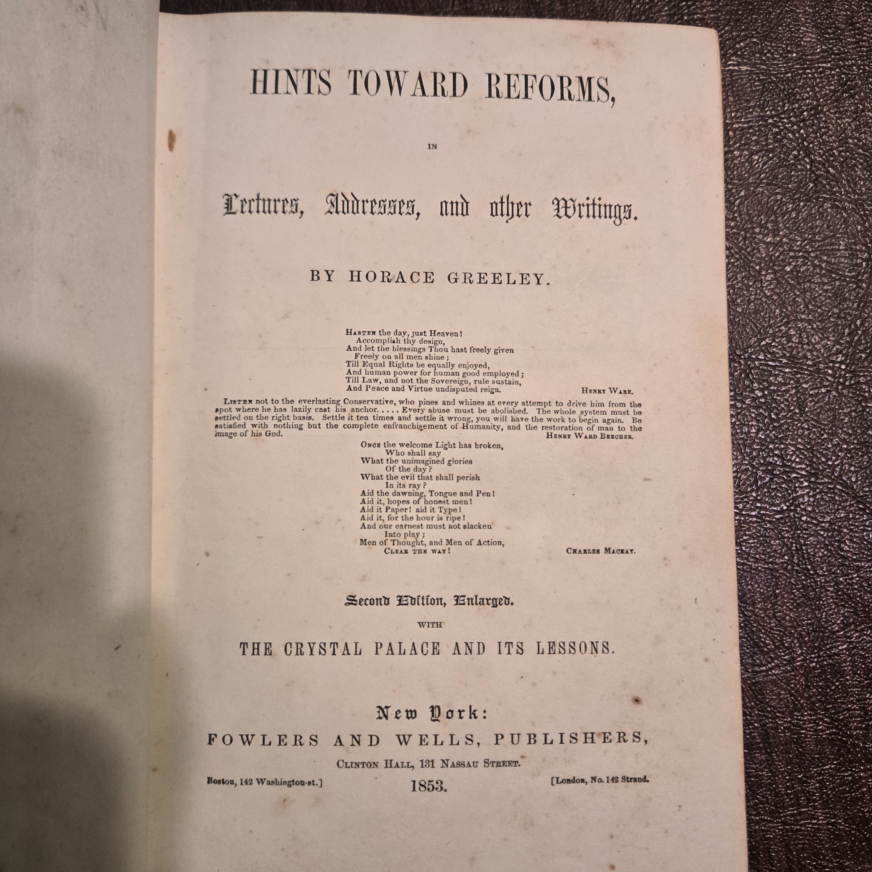 I returned today from Shabbat services not clear what my blog post would look like. I decided to go to another random bookshelf and report on what was there, but I did not get beyond the first book, Hints at Reforms by Horace Greeley. When I took it down, this post began to write itself. It is, in reality and substance, a bit “off the wall”.