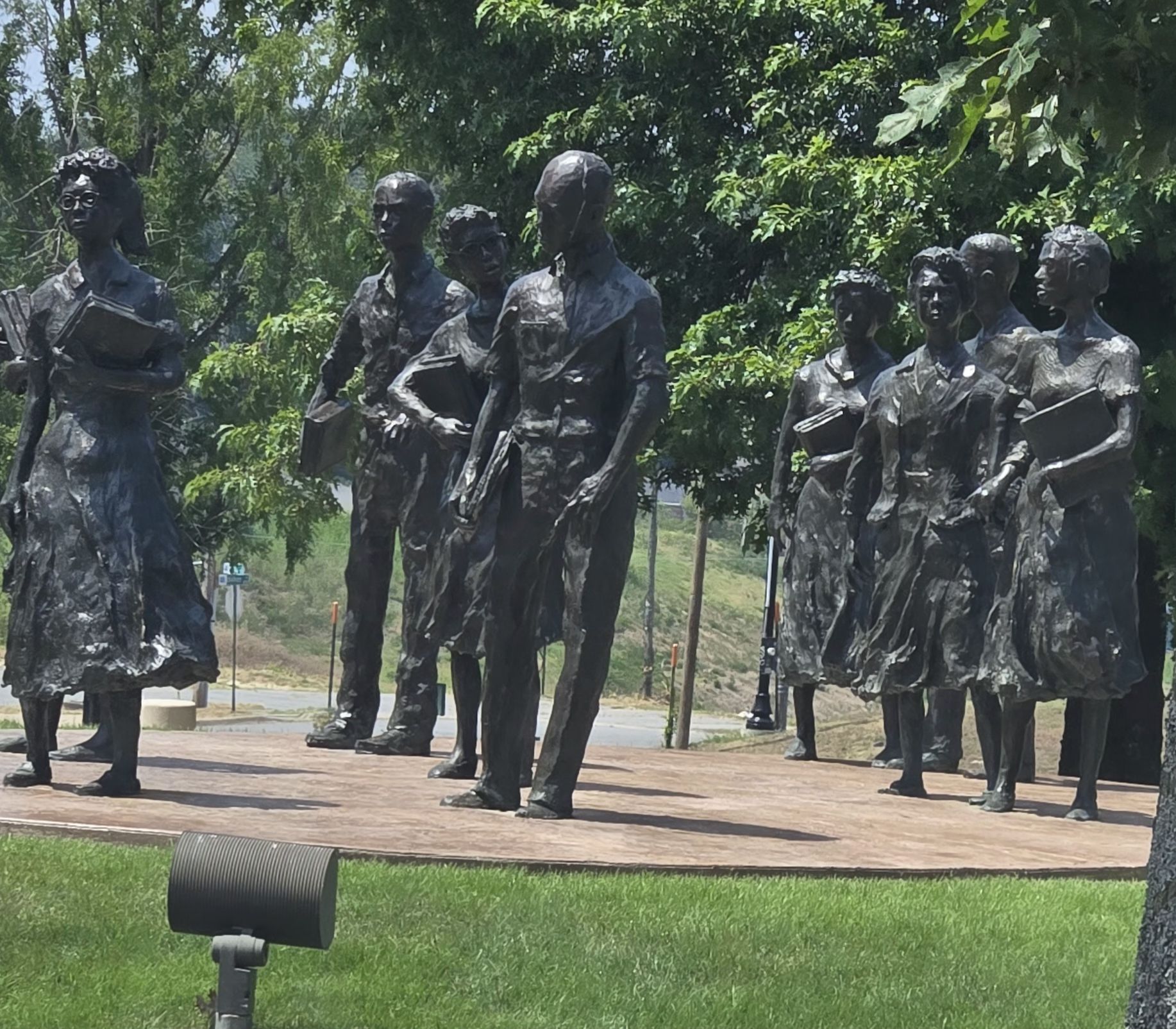We found a delightful brunch spot near their house, The Root Cafe for omelettes and a wonderful salad, and then headed downtown. Boy, is downtown Little Rock quiet on a summer Sunday afternoon. A lot of buildings, mostly attractive and no longer new (but widely spread), but no people. Then we drove around the state capitol building, mainly to see the statues of the Little Rock Nine, who integrated Central High School.