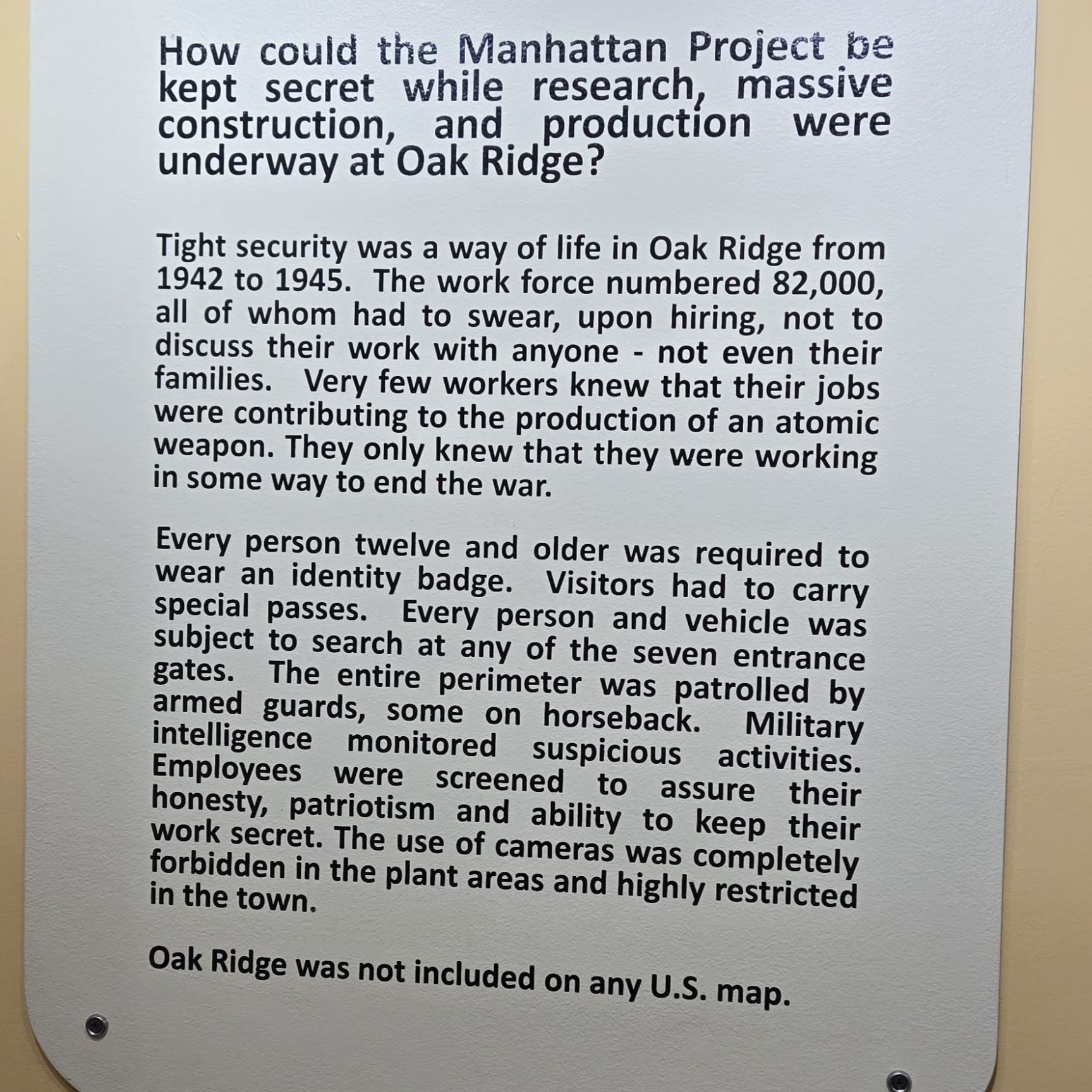 Oak Ridge, you may be aware, was a secret town created in the wilds of rural Tennessee by the federal government starting in 1942 to provide a site to convert uranium ore into a fissionable material, with the goal of developing an atom bomb before the Nazis could.